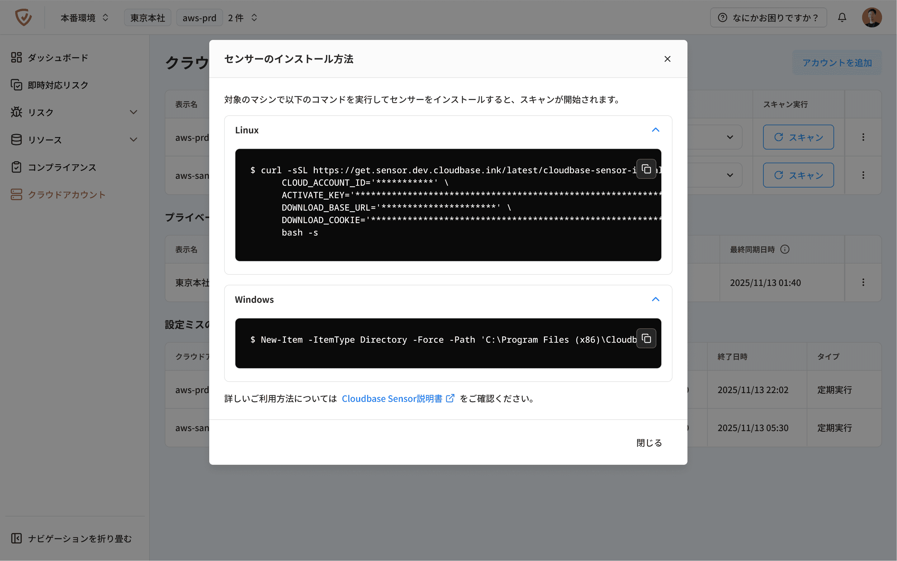Windows のCloudbase Sensorのインストールコマンドが表示されますので、コピー&ペーストを行い対象マシン上のPowershellで実行してください。これによりインストールが完了します。