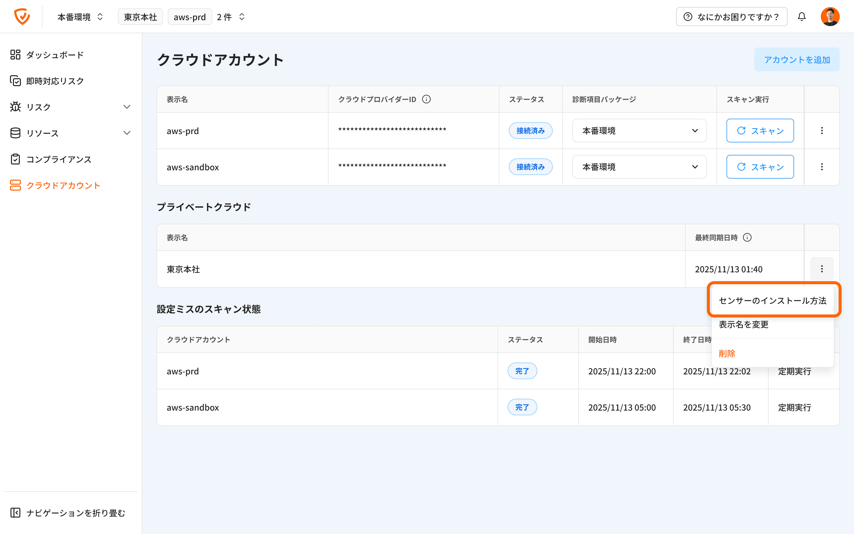 「クラウドアカウント」ページで、接続済みクラウドアカウント一覧の各行にある「 ⋮ 」メニューをクリックします。