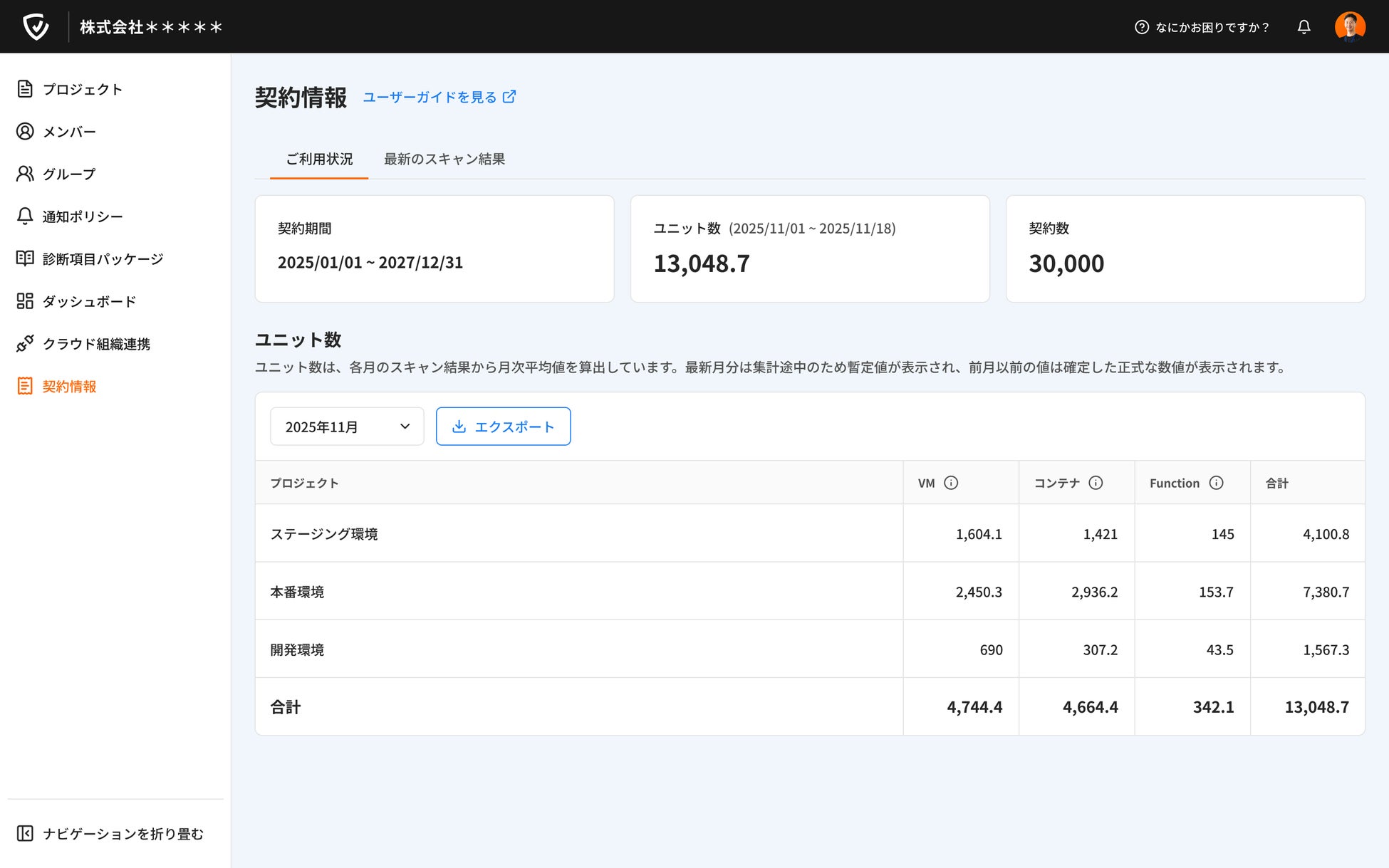 これまでの「契約情報」画面では、各プロジェクトの最新のスキャン結果をもとにした「概算ユニット数」を一覧でご確認いただけるのみとなっており、料金算出の基準となるユニット数については、弊社運営まで別途お問い合わせいただく必要がありました。そのため、ご利用いただいている皆さまには、これまで以上にスムーズに管理いただけるよう、今回のリリースにより、プロダクト上からユニット数も直接ご確認いただけるようになりました。これにより、契約情報をより正確かつスムーズにご確認いただけるようになります。なお、これまで通り、最新のスキャン結果も引き続きご覧いただけます。